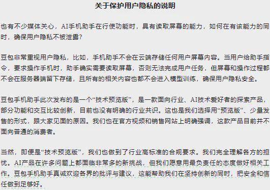 二是,针对“豆包 AI 助手侵犯用户隐私”的质疑,豆包方面回应称,AI 助手读取屏幕内容时,不会在云端存储任何相关数据,且所有屏幕信息均不会用于模型训练;此外,AI 助手执行长时任务时,屏幕会出现明确提示,用户可随时中断操作,全程具备可控性。