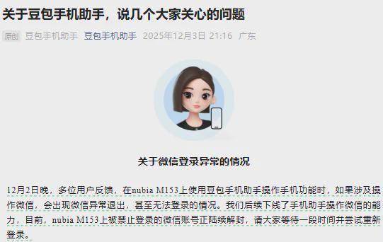 当日晚 9 点,豆包官方发布公告,宣布下线 AI 助手操作微信的功能;同时表示,合作机型 nubia M153 上被限制登录的微信账号将陆续解封。