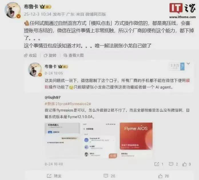 随后,华为小艺、小米小爱、荣耀 YOYO、vivo 小 V、魅族 Aicy 等主流手机厂商的 AI 智能体,均无法再直接调用微信功能(包括发送微信语音、发红包等);8 月,微信再次封禁一批 AI 代理产品的相关权限,进一步释放了严禁通过模拟点击等方式操作微信的明确信号——坊间甚至流传着“AI Agent 要想撬开微信生态,只能等 Allen Zhang 亲自做”的调侃。