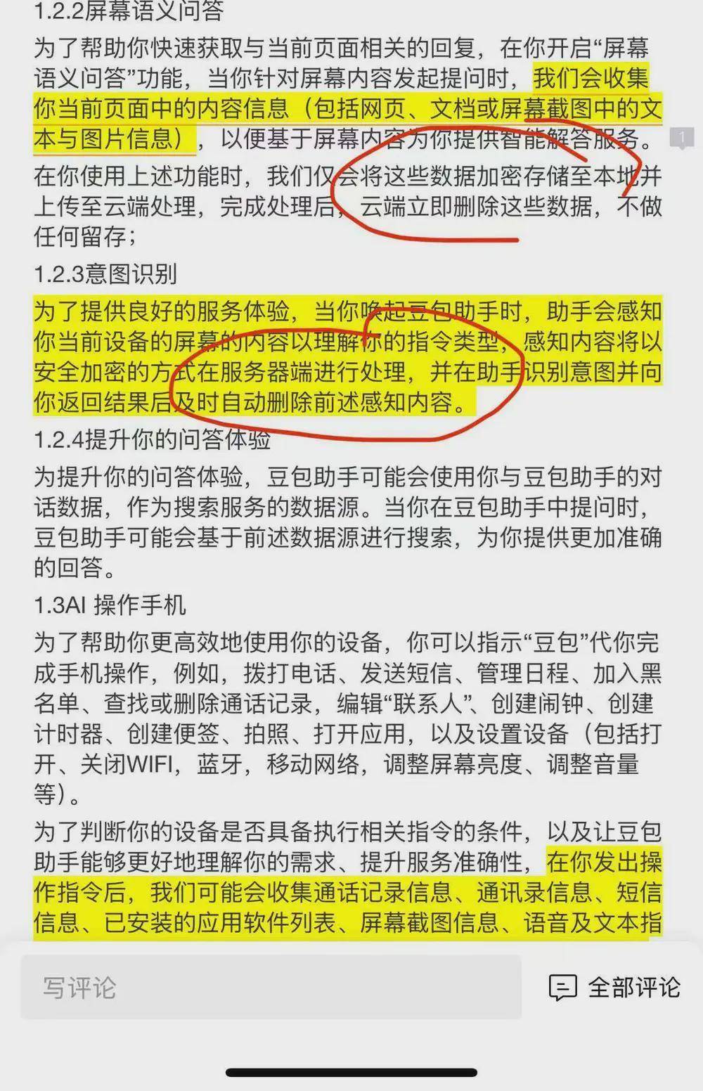 虎嗅查阅豆包 AI 助手《隐私安全白皮书》发现,其中关于“AI 操作手机”的说明显示:用户发出操作指令后,平台可能会收集通话记录、通讯录、短信、已安装应用软件列表、屏幕截图、语音及文本指令等信息;且相关条款明确注明,上述数据会先加密存储于本地,再上传至云端进行处理。