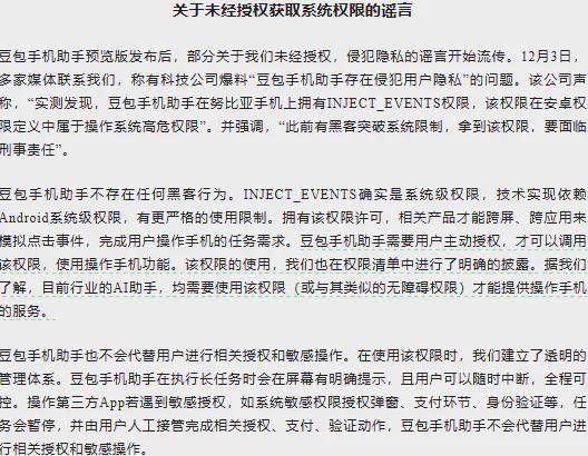 一是,针对“豆包 AI 助手未经授权获取系统权限”的质疑,豆包方面表示,INJECT_EVENTS 确实属于系统级权限,但 AI 助手调用该权限需用户主动授权,且权限使用情况已在权限清单中明确披露。
