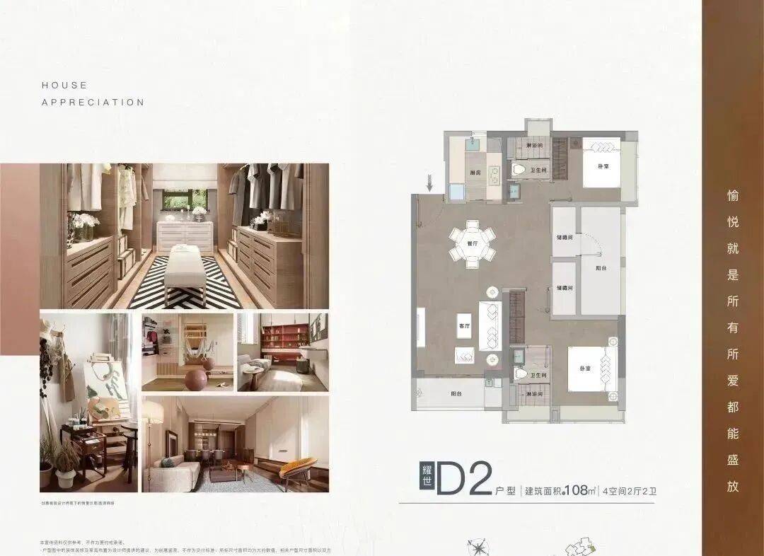 108㎡平层的户型也是有园景加持,主次卧均有飘窗设计,阳台加储藏间可分可根据家庭不同需求改造成大三房或小四房。
