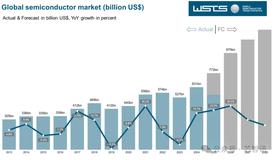 世界半导体贸易统计组织(WSTS)近日公布的最新半导体行业展望数据显示,全球芯片需求复苏有望在2026年继续强势上演,并且自2022年末期以来需求持续疲软的MCU芯片以及模拟芯片也有望踏入强劲复苏曲线年全球半导体市场将增长22.5%,总价值将达到7722亿美元,高于WSTS春季给出的展望;2026年半导体市场总价值则有望扩张至9755亿美元,接近SEMI预测的2030年1万亿美金的市场规模目标,意味着有望同比大增26%。