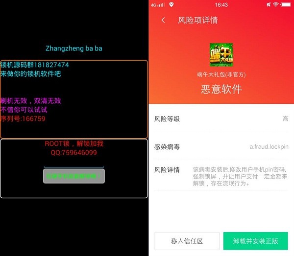 原来,职员小李下载的“端午大礼包”是一款恶意软件,含有名为“a.fraud.lockpin”的病毒,该病毒在安装后会修改用户手机pin密码,强制锁屏,用户需要根据提示支付一定金额才能够解锁手机,存在流氓行为。看似是恶作剧,实则是强制用户付费,侵犯了用户的手机、财产安全。