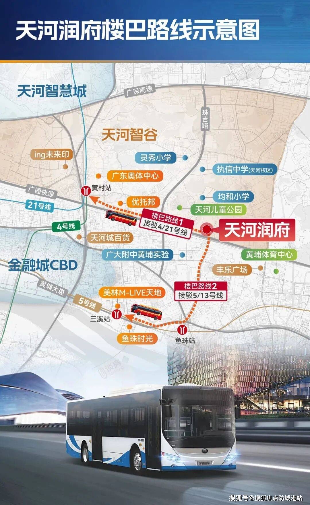 A4:项目交通优势显著,自驾靠近广园快速路、黄埔大道等城市主干道,通达核心商圈便捷。公共交通方面,项目是市中心首个配套楼巴的社区,交付后5年业主免费使用,楼巴直达奥体中心(接驳地铁4/21号线黄村站)和鱼珠-三溪商圈(接驳地铁5/13号线鱼珠站),同时还将配建公交站场,进一步完善公共交通网络。