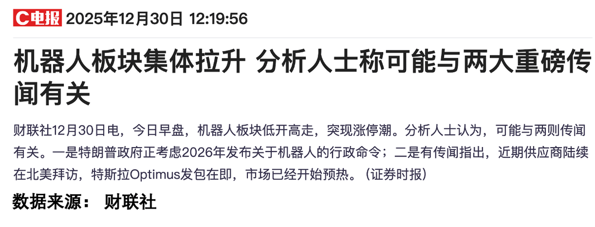 今天显然是「机器人」一枝独秀的局面,从国内到海外多个利好共振,被认为是今天「机器人板块」大涨的关键,除此以外还AI智能体也火了一把,具体来说有以下几件事值得关注。