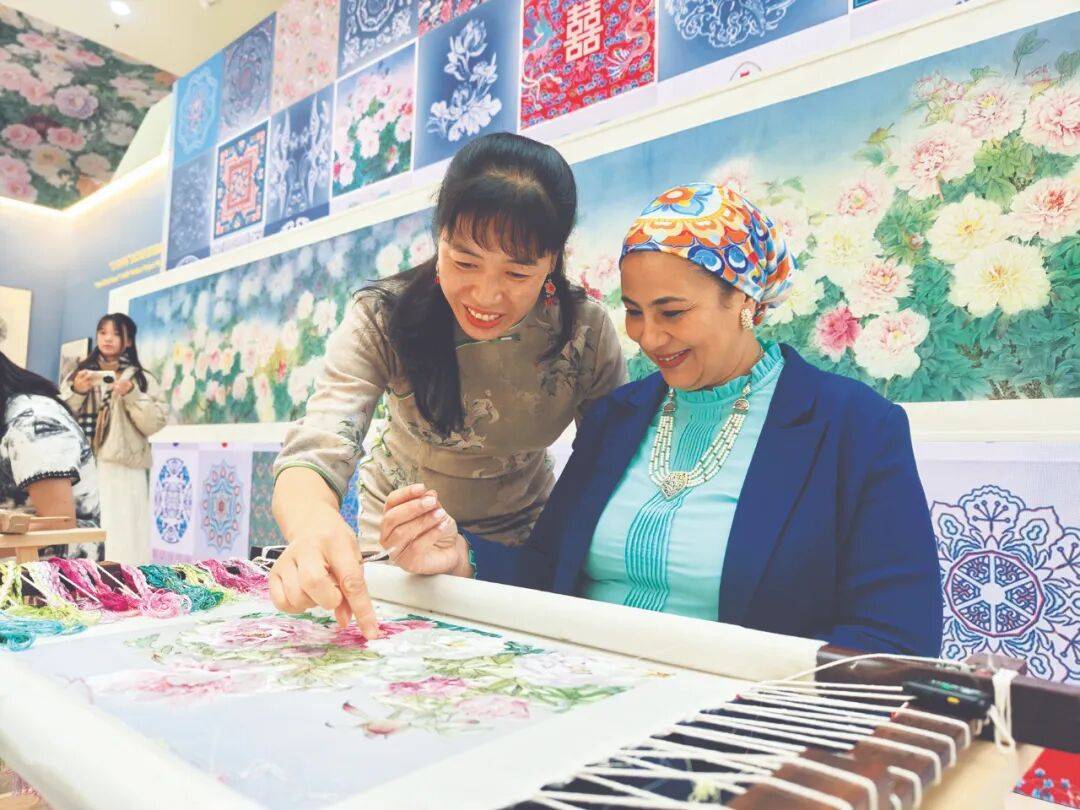 中华文明璀璨悠久,为数智时代发展提供了丰厚养分。文化传承与科技创新融合,使中国妇女精神世界愈加充盈的同时,更为她们书写昂扬奋进的巾帼华章提供了广阔的舞台。文化传承区是展览的特色展区,以“科技创新文化新活力”为主题,通过数字化与实物相结合的呈现方式,面向中外观众充分展示中国丰富的历史文化遗产、非物质文化遗产、文物精品、博物馆事业以及数字技术赋能文化发展的新成果。在这一展区,展览邀请到多位女性国家级非遗传承人,现场展示刺绣等数智赋能非遗传统技艺的创新成果,与中外嘉宾手拉手共同演绎侗族大歌,尽显妇女在数字时代推动中华优秀传统文化创造性转化、创新性发展中的主动作为。