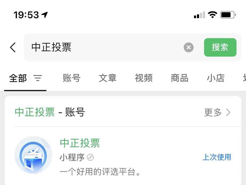 1.首先打开微信,点击“发现”“小程序”,在搜索框中输入“中正投票”,点击进入小程序。