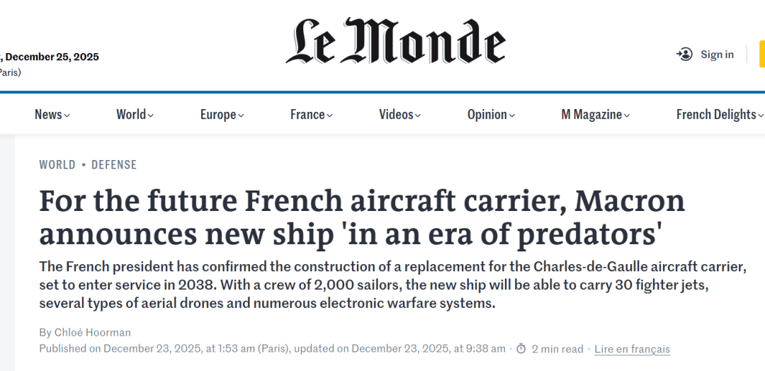 关于新航母的建造,法国发行量最大、声誉最高的报纸《世界报》在报道的标题中,引用了马克龙讲话中的这句话:“在这个掠食者横行的时代,我们必须强大才能令人畏惧。尤其是在海上!”