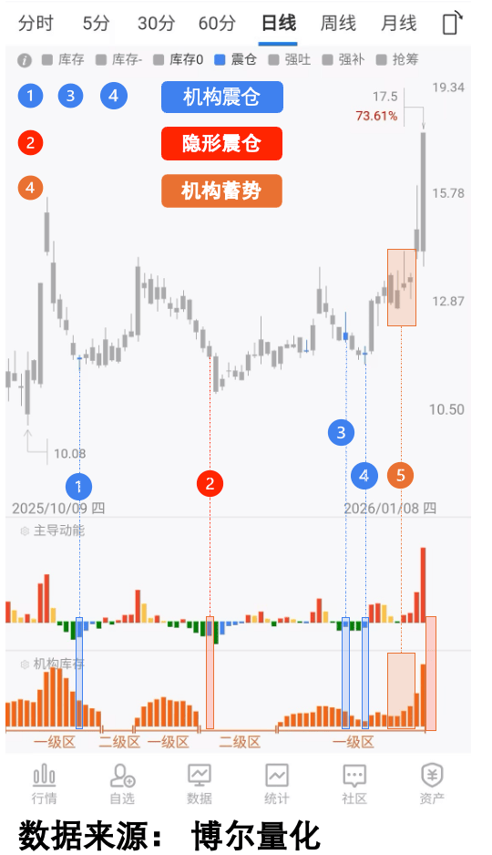 ——股价创了新低,但博尔数据显示:机构库存暂时“消失”(机构没积极交易),但股价处于“二级区”(机构在悄悄等机会),后来出现“空头回补”——这是机构“被动震仓”,表面弱,实际在低位补仓!