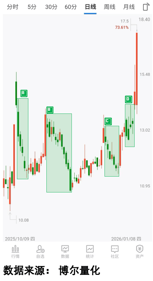 各位投资者,咱们先站在“事后诸葛亮”的上帝视角看第一张图——从2025年10月到2026年1月,股价明明经历了A、B、C、D四轮明显调整,可最后结果呢?股价不仅突破前期高点,还在短短一周内涨幅超过50%!