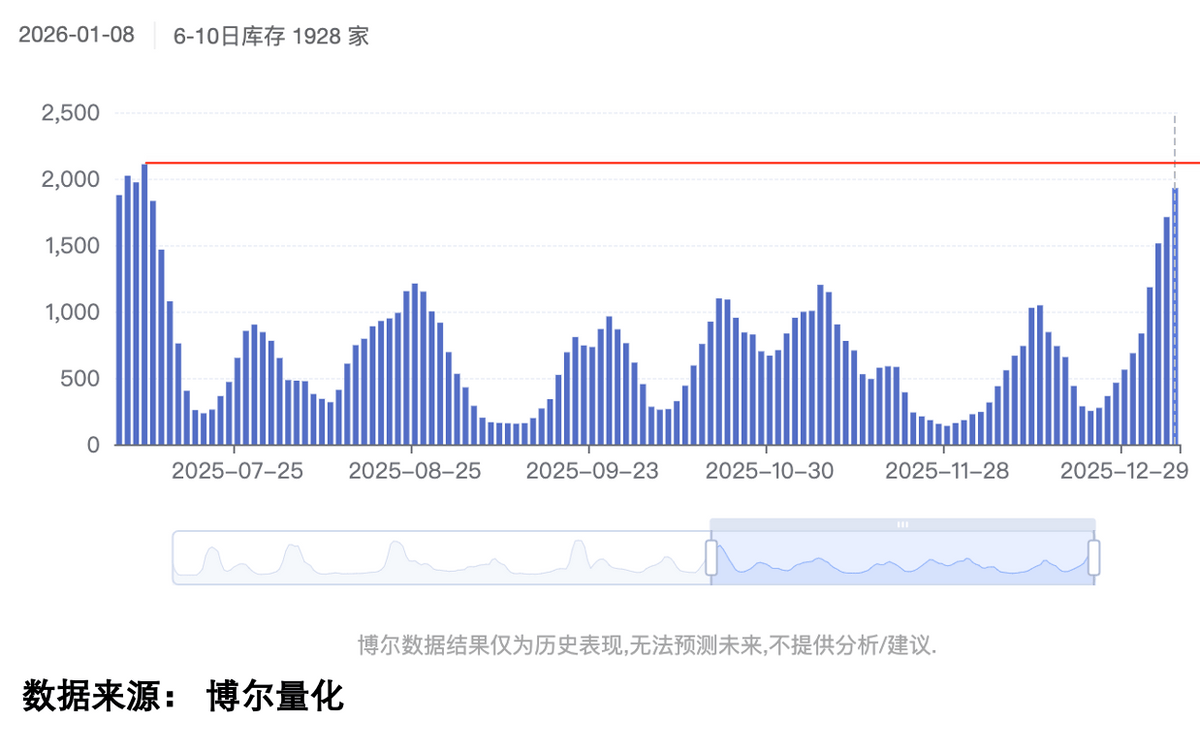 那是不是意味着行情全面爆发呢?回顾下去年8月的行情,当时不就是走出了极端的半导体和其他股的走势,为什么会这样呢?因为连续得到「机构资金」关注的个股数量毕竟是有限的,而今天「6-10日库存」数据也创了去年7月以来的新高,这代表两个意思,一方面机构还在蓄力,说明行情远没有结束,另一方面就是这一轮行情大概率和去年一样,是一种「一九开」的表现。