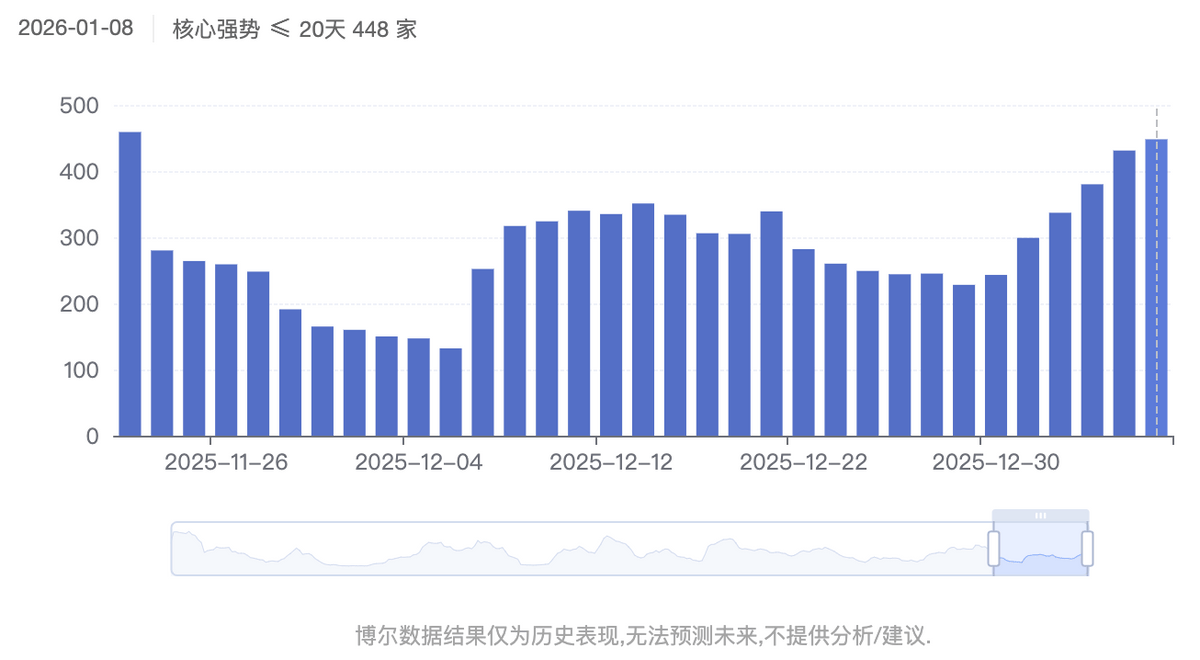 那么机构会如何评估风险呢?当然是看股价是不是远离他们的成本线,所以当今天「核心强势≤20天」这个数据创下阶段新高的时候,就可以说得通了,这轮行情从去年年底我提示大家机构开始和游资交接,到现在也就是20个交易日左右,在这个区间内股价原理成本区,那么相对是安全的,当然离开很多,最终是要回归的,但是眼下行情氛围好啊,所以,相比之下,如果还在机构成本附近,那就意味着两件事情: