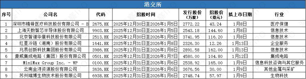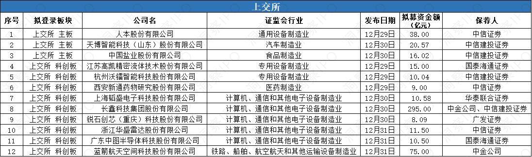2025年12月29日-2026年1月5日,上交所主板有3家公司递交上市申请,科创板有9家公司递交上市申请;深交所主板有1家公司递交上市申请,创业板有3家公司递交上市申请。
