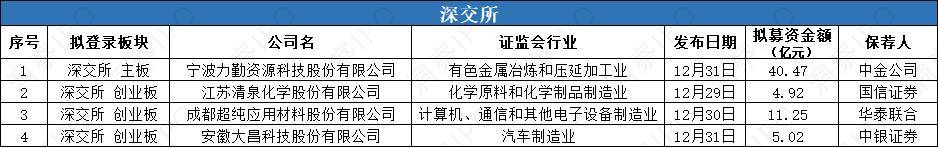 12月31日,宁波力勤资源科技股份有限公司(以下简称“力勤资源”)深市主板IPO获受理,保荐机构为中金公司。