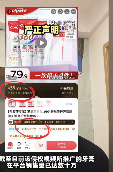 近日,一网友发布视频称,社交平台账号@高露洁Colgate口腔修护牙膏直播间在其不知情的情况下,擅自使用了其2025年2月28日发布的原创视频,用于商业营销传播。