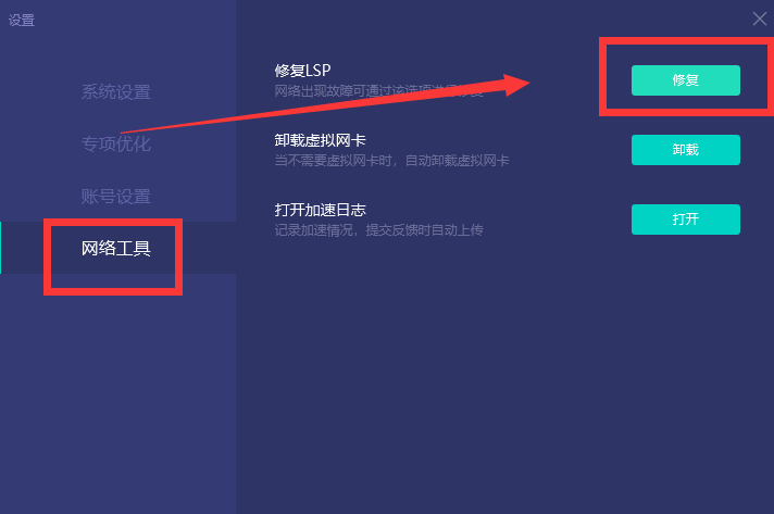 打开网易UU加速器,点击右上角加速器设置,找到【网络工具】,点击修复LSP,即可一键检索并修复玩家网络异常,修复完成后登录Steam即可。