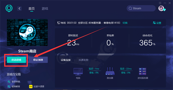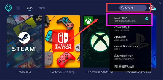 打开UU加速器,在右上角搜索Steam并点击开启一键加速小火箭怎么安到电脑上面,加速完成后点击【启动游戏】即可开启Steam,这时候再输入账号密码就能解决无法登陆的问题了。