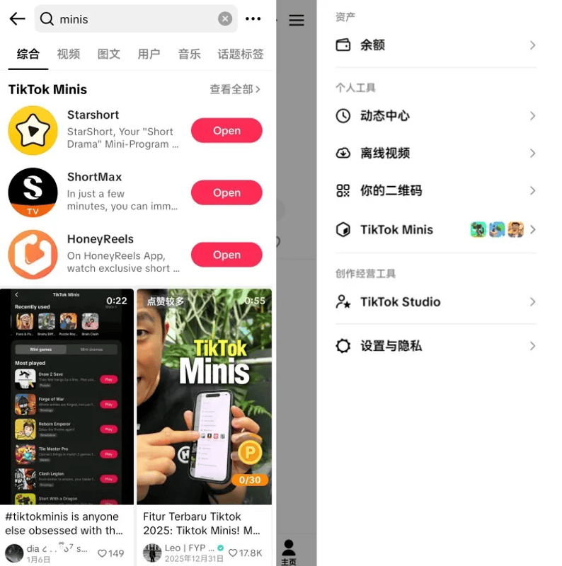 此前测试过的小程序玩法,正式升级成为了内嵌的小程序专区 TikTok Minis。和国内抖音小程序的运营逻辑一致,TikTok Minis 的核心优势在于能够 “即点即玩”,用户不用离开 TikTok 就能体验到互动小游戏、微短剧等多元内容。