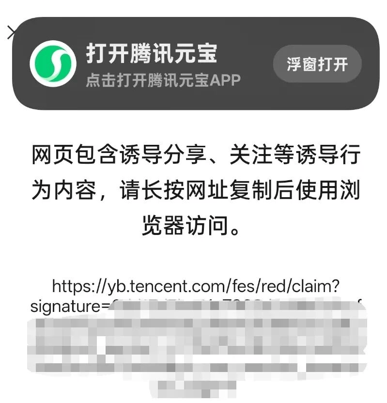 2月4日早些时候,微信和元宝用户开始发现,元宝红包分享到微信时打开跳转会出现警告。 警告内容显示:网页包含诱导分享、关注等诱导行为内容,请长按网址复制后使用浏览器访问。 经测试,iOS 上已无法自动/快捷跳转,用户需复制网址打开浏览器进行跳转;在部分 Android 机型上,由于厂商做了单独识别,仍然能够通过激活浮窗等方式实现快捷跳转。