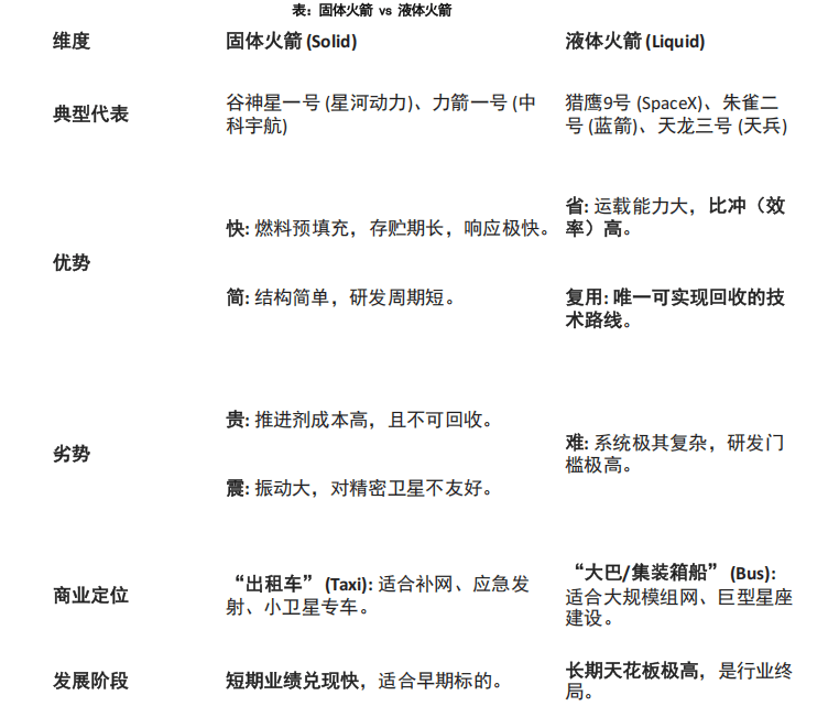 国内市场格局:固体第一梯队(已商业化):中科宇航(背靠中科院)、星河动力(连续发射成功率高)。液体第一梯队(在研/试飞): 蓝箭航天(甲烷机领先)、深蓝航天(死磕回收)、天兵科技