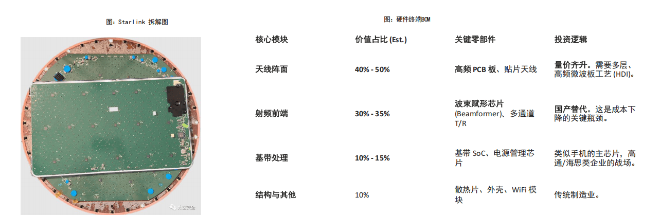 Gateway (信关站): 类似于电信的核心骨干网节点。数量少,单价高 (ToB/G)。User Terminal (用户终端): 类似于“路由器”或“手机”。数量极大,单价敏感 (ToC)。未来最大的增量