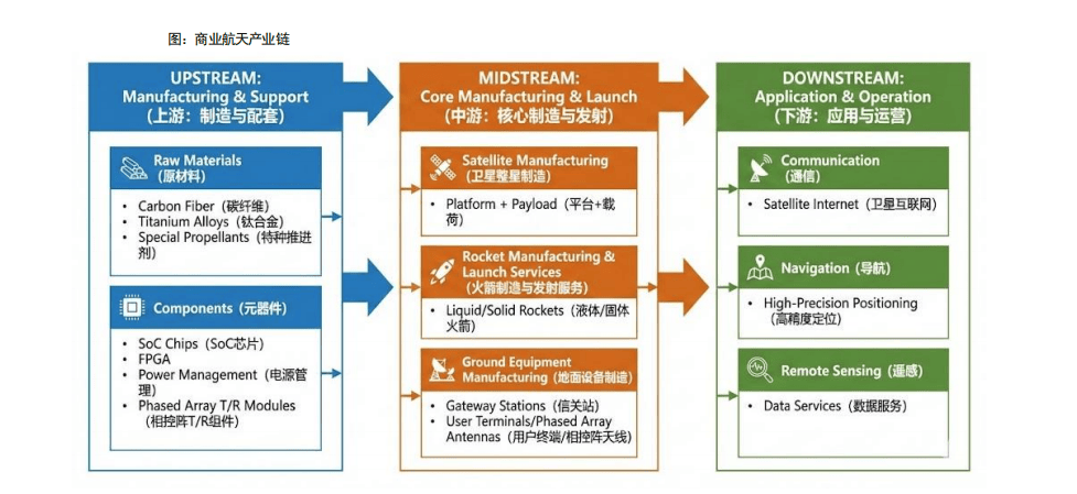 上游(制造与配套):原材料(碳纤维、钛合金、特种推进剂)。元器件(SoC芯片、FPGA、电源管理、相控阵T/R组件等)