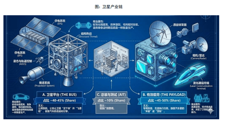 卫星制造 (Satellite Manufacturing) —— 占比 ~5% (约170亿美元);现状: 虽然占比小,但由于“千帆星座”等巨型星座建设,未来3年该板块增速将是全产业链最快 (CAGR 30%)。