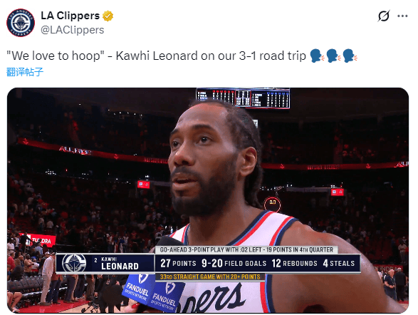 赛后谈到小卡绝杀中投,快船主教练泰伦-卢说道:拜托,这是莱昂纳德,比赛到了关键时刻,我们知道球该给谁。