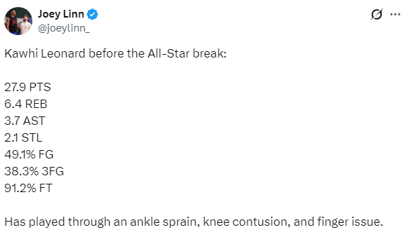 快船队记Joey Linn晒出了小卡全明星周末前的数据,他场均拿到27.9分6.4篮板3.7助攻2.1抢断,三项命中率分别是49.1%、38.3%和91.2%,他带着脚踝扭伤、膝盖挫伤和手指受伤坚持比赛。