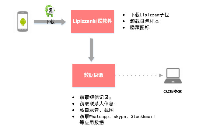 第二阶段:Lipizzan“间谍软件”在安装运行后,能对被感染的设备进行检测,当设备环境符合一定标准后获取设备的root权限,对用户的短信记录、联系人名录、电子邮件甚至是一些知名APP的隐私数据等进行收集,并在用户毫无感知的情况下上传至攻击者服务器。
