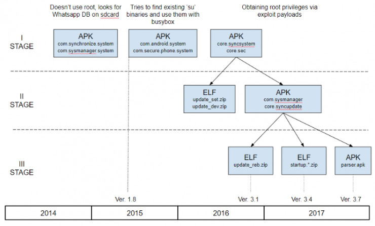 Lookout 的研究人员认为,Chrysaor “间谍软件”可以通过基于 SMS 的钓鱼信息来进行传播,就像 Pegasus 感染 iOS 设备一样。且 Chrysaor 利用了名叫 Framaroot 的著名 Android 漏洞来 root 目标设备并获取设备的完整控制权,以便其从热门的 App 中窃取数据。更重要的是,从 Chrysaor“间谍软件”最初使用至今,NSO Group 很可能还发现了很多新的Android 0 day漏洞,并将相应的漏洞利用代码更新到了新版本的 Chrysaor“间谍软件”之中。