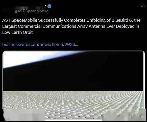 223平方米相控阵天线日,AST SpaceMobile宣布其BlueBird 6卫星在低轨成功展开约223平方米相控阵天线,创全球商用最大通信阵列纪录。该天线 Mbps峰值速率,带宽容量达前代卫星十倍,可为全球标准智能手机提供完整4G/5G蜂窝宽带服务,包括语音、数据和视频。
