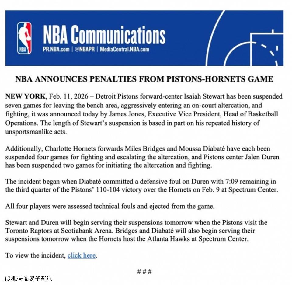 针对黄蜂与活塞的超大规模冲突,NBA官方火速理清事件脉络,公布对于4名参与冲突球员的具体处罚,合计禁赛17场比赛。