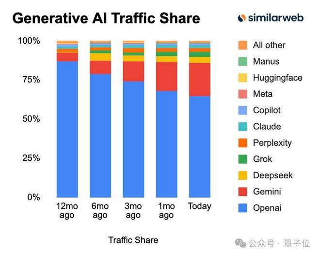 这套打法并不罕见,因为谷歌也是这么干的。根据Similarweb最新发布的《2026年全球AI追踪报告》,曾经独占鳌头的ChatGPT,市场份额从一年前的86.7%下降到64.5%;而Gemini的市场份额从5.7%增长到21.5%,成为其最强劲的竞争对手。