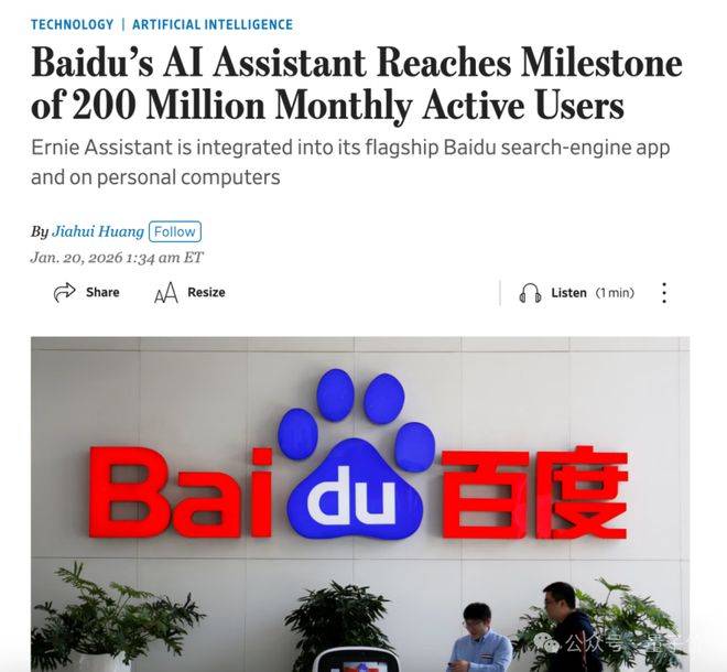 1月20日,据《华尔街日报》报道,百度文心助手月活数已突破2亿;1月27日,QuestMobile发布报告,百度App文心助手在“AI赛道用户规模NO.1应用榜”中名列第一。