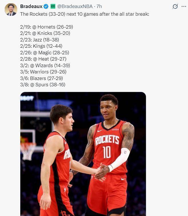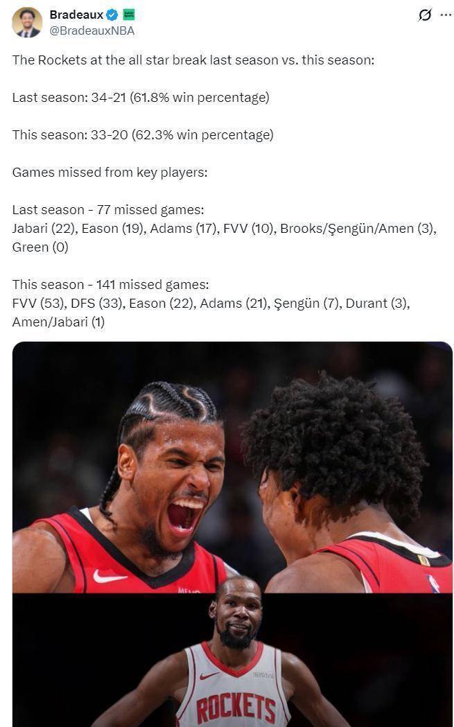 火箭队目前的战绩是33胜20负,胜率62.3%。有趣的是,上赛季打完53场比赛时,他们的战绩同样是33胜20负。这意味着在阵容经历了休赛期重大升级(引入杜兰特等人)后,球队在常规赛战绩上似乎陷入了“原地踏步”的怪圈。西部的竞争版图异常胶着,从第三名到第七名之间可能只有三场左右的胜场差。每一场比赛的胜负都可能引发排名的剧烈变动。火箭队需要在这最后的29场比赛中,找到解决进攻端空间问题和控卫组织问题的钥匙,同时还要应对密集赛程带来的体能和伤病风险。航天城的这个春天,注定不会平静。返回搜狐,查看更多