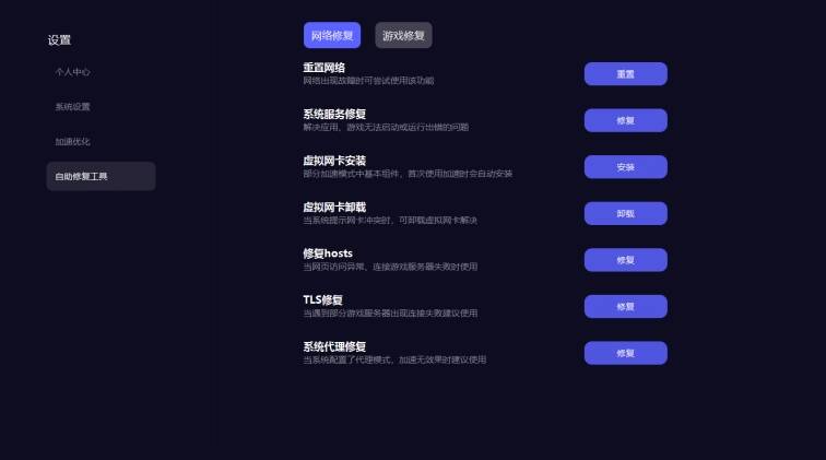 如果本地网络出现问题的话,可以使用加速器内置的修复工具来解决。在加速器的设置页面中,找到【自助修复工具】,选择右侧的【重置网络】就可以了。