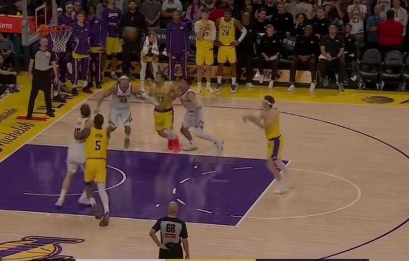 常规时间最后9秒,湖人落后3分,且没有暂停。掘金采取“点球战术”,将奥斯汀·里夫斯送上了罚球线。里夫斯第一罚稳稳命中,将分差缩小到2分。第二罚,篮球划出弧线,故意砸在篮筐前沿左侧,弹回的方向恰到好处。
