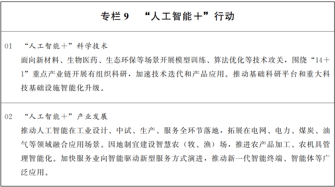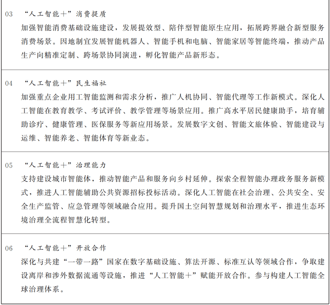 强化人工智能基础研究创新能力建设,打造人工智能应用中试基地,推动基础大模型轻量化部署和行业模型开发,促进模型迭代提升和场景适配。培育数据处理和数据服务产业,构建数据资源供给体系,为人工智能发展提供数据支撑。围绕各领域需求培育开放典型应用场景,发展“模型即服务”“智能体即服务”等模式,构建以场景应用为牵引的人工智能产业生态。聚焦科技、产业、消费、民生、治理、开放合作六大领域,着力提升智能终端、智能体等应用普及率,推动人工智能与经济社会各行业各领域广泛深度融合,促进生产效率提升、产业结构优化、生活方式重塑,构建智能经济和智能社会新形态。