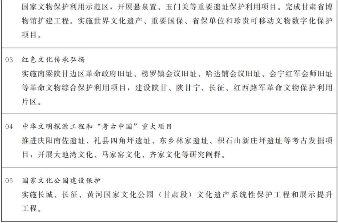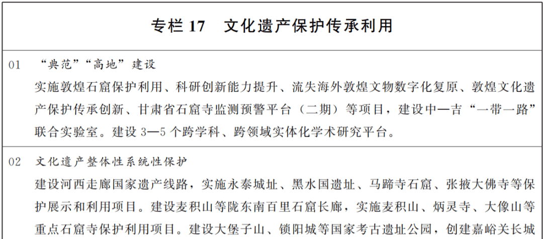 深度挖掘积淀深厚的历史文化资源,提高文化遗产整体性系统性保护水平。健全文化遗产保护传承体制机制,推动完善法规制度体系,强化文化遗产系统性保护和统一监管督察。实施文物保护提质、研究阐释突破、活化利用创新、安全守护夯基行动。加快敦煌研究院世界文化遗产保护“典范”和敦煌学研究“高地”建设,推进流失海外敦煌文物数字化复原,掌握敦煌文化研究话语权。建好用好长城、长征、黄河国家文化公园,加快建设河西走廊国家遗产线路,建设嘉峪关长城国家文物保护利用示范区。实施中华文明探源工程和“考古中国”重大项目,推进国家考古遗址公园建设。实施甘肃文化研究工程,强化文物和古籍保护研究利用,挖掘用好文化遗产蕴含的时代价值。深入实施中华优秀传统文化传承发展工程。加强历史文化名城名镇名村街区和传统村落、历史聚落保护。加强非物质文化遗产有效保护和活态传承,实施区域性、全省性重点非遗活动,加大传播普及力度。打造羲皇故里、麦积石窟、崆峒问道、丝路长城、万里长征、九曲黄河、河西走廊等中华文明甘肃标识。加强和改进地方志工作。