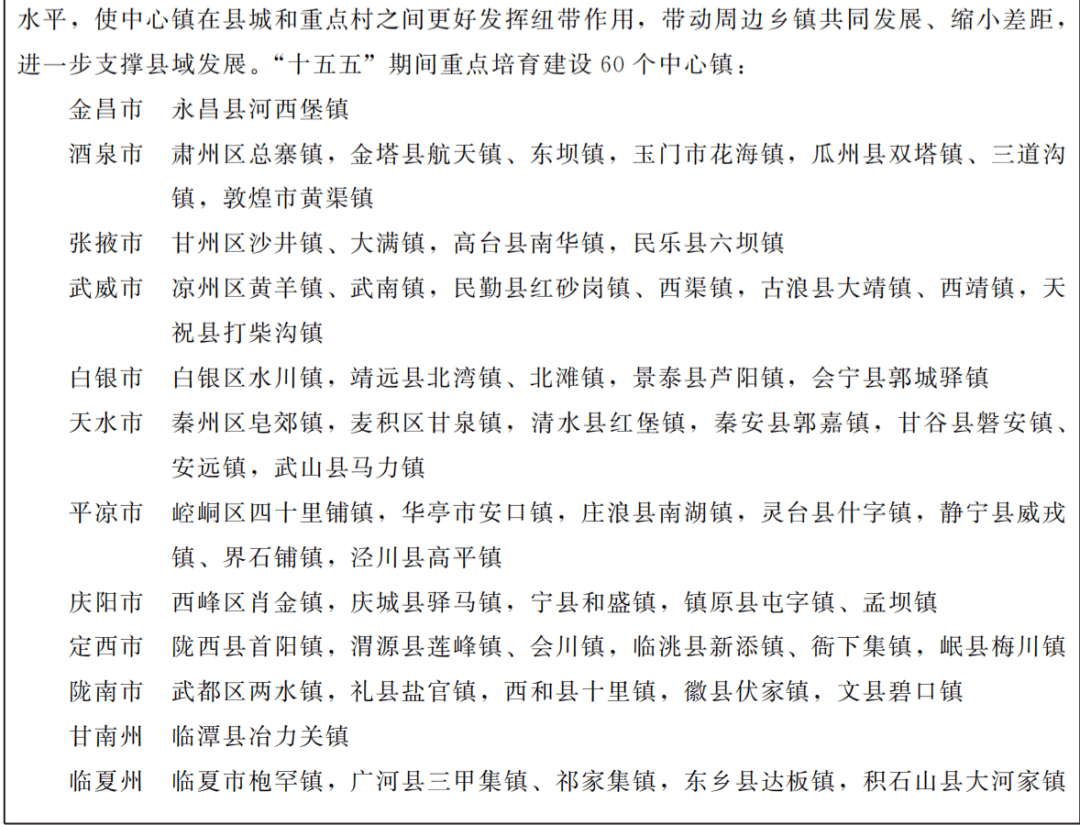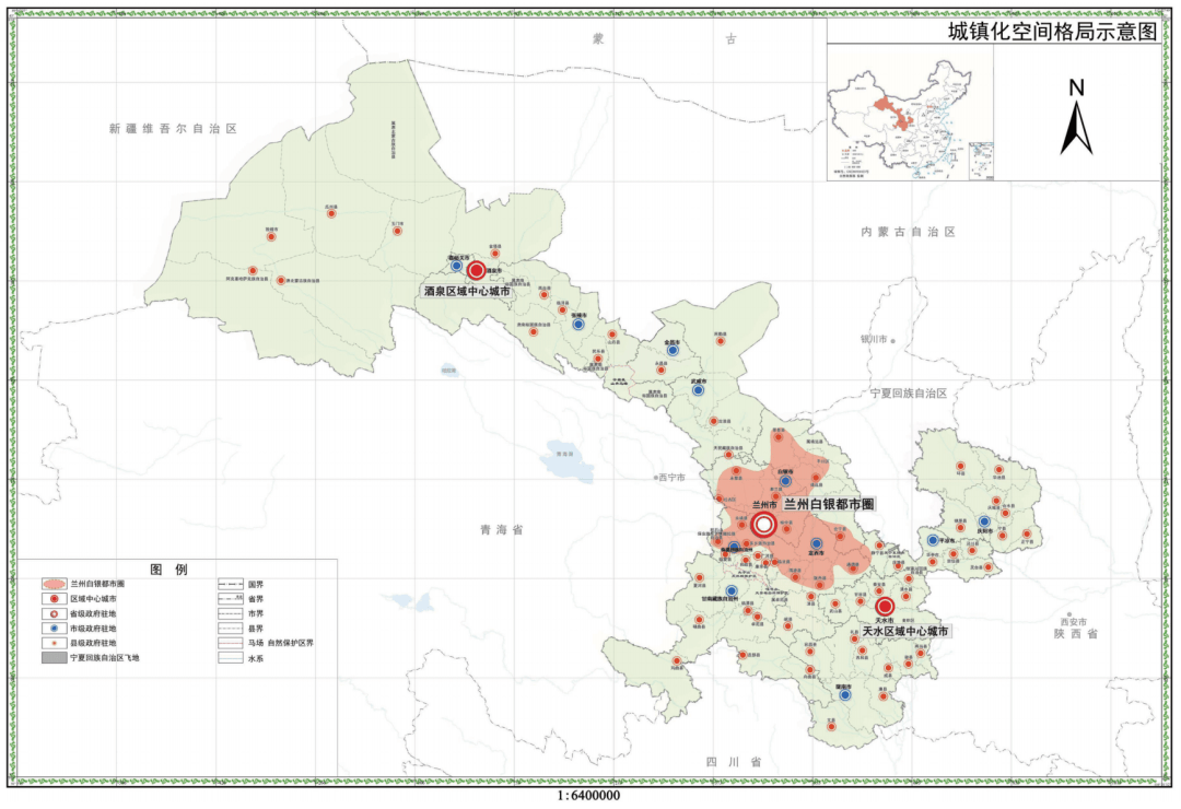 依托河流、山峦等自然地理格局,结合区域经济发展布局,优化城市发展空间结构,促进大中小城市和小城镇协调发展。加快培育建设“一核”—兰州白银都市圈,充分发挥兰州、白银区位、创新资源和产业基础等优势,以推进同城化、一体化进程为重点,推动通勤便捷高效、产业梯次配套、生活便利共享,辐射带动定西临夏新型城镇化建设,提高1小时通勤圈协同发展水平。加快酒泉、天水两个区域中心城市建设,依托区位优势、资源禀赋,支撑河西走廊、陇东南经济带高质量发展。酒泉区域中心城市重点加快酒嘉一体化进程,健全基础设施、公共服务、市场等同城化发展体制机制。天水区域中心城市重点推动秦州、麦积建成区和三阳川地区错位协同发展,增强城市综合承载能力。提升张掖、武威、平凉、庆阳、陇南、嘉峪关、定西、金昌等中小节点城市纽带作用,提高合作、临夏、玉门、敦煌、华亭等城市功能品质。有序推进临夏市、临夏县公共资源和要素配置一体化发展。