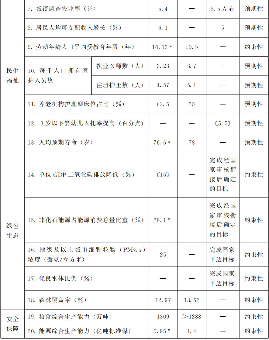 注:①〔〕为5年累计数。②带*的为2024年数据。③全社会研发经费投入增速按不变价格计算。④粮食综合生产能力指可以稳定达到的粮食产出能力。