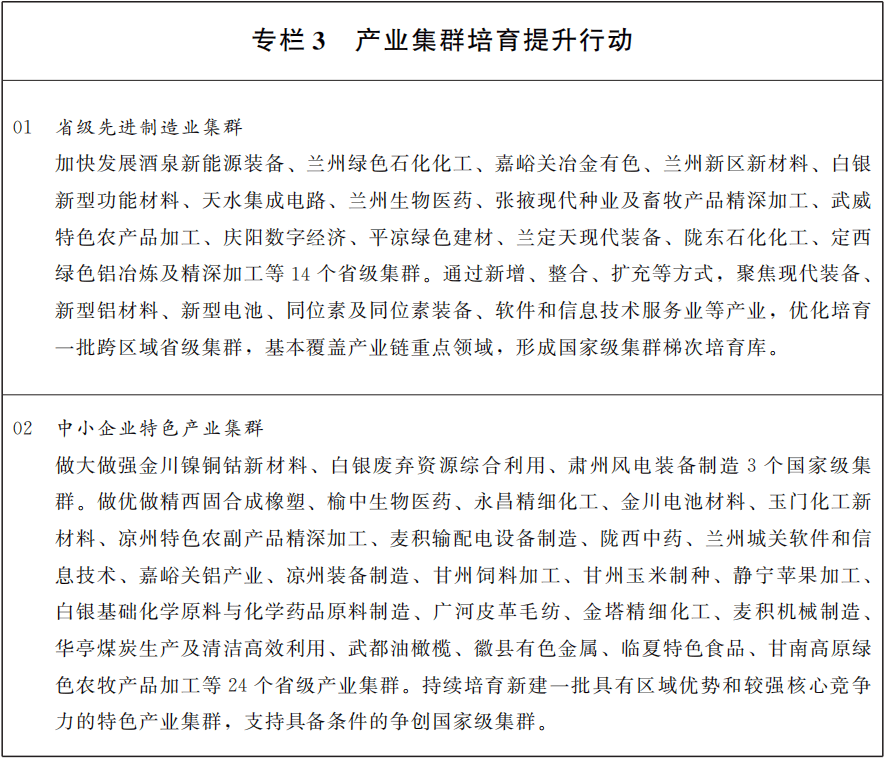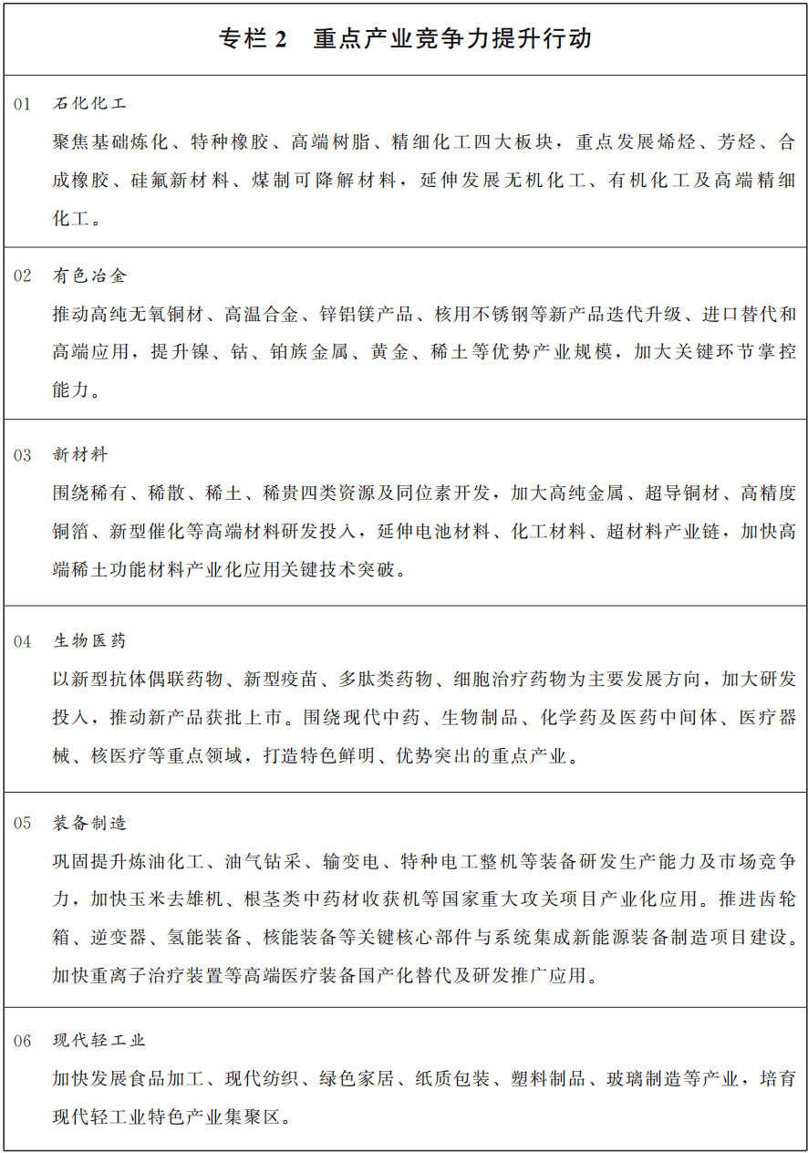 聚焦打造“甘肃制造”,坚持国家标准引领、数智绿色技术赋能、环保安全制度约束,推动重点产业提质升级、制造业技术改造升级。实施石化化工产业延链补链行动,持续推进“减油增化增特”,推动精细化工产业发展,提升合成树脂、特种橡胶、有机助剂等高端产品供给水平,积极发展煤基新型合成材料、先进碳材料、可降解材料等产业链,提升化工新材料领域竞争力。推动煤化工产业向现代化、高端化、多元化转型。实施有色冶金产业高端延伸行动,壮大镍钴、精品铜铝加工等千亿级产业链,做精高端特种钢材产业,发展稀有、稀散、稀土金属产业和黄金等贵金属产业。实施装备制造产业提档扩能行动,做强做优电工电气装备、石化通用装备、通用航空装备、高档数控机床、现代农机装备等细分行业,壮大工业母机产业集群,全力打造装备制造产业集聚区。培育壮大现代轻工业。实施制造业技术改造、大规模设备更新,加快推动工艺技术升级迭代。强化市场优胜劣汰机制,畅通落后低效产能退出渠道。加快制造业数智化转型,提升绿色制造水平。