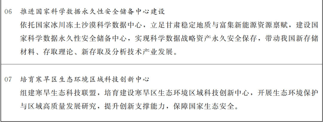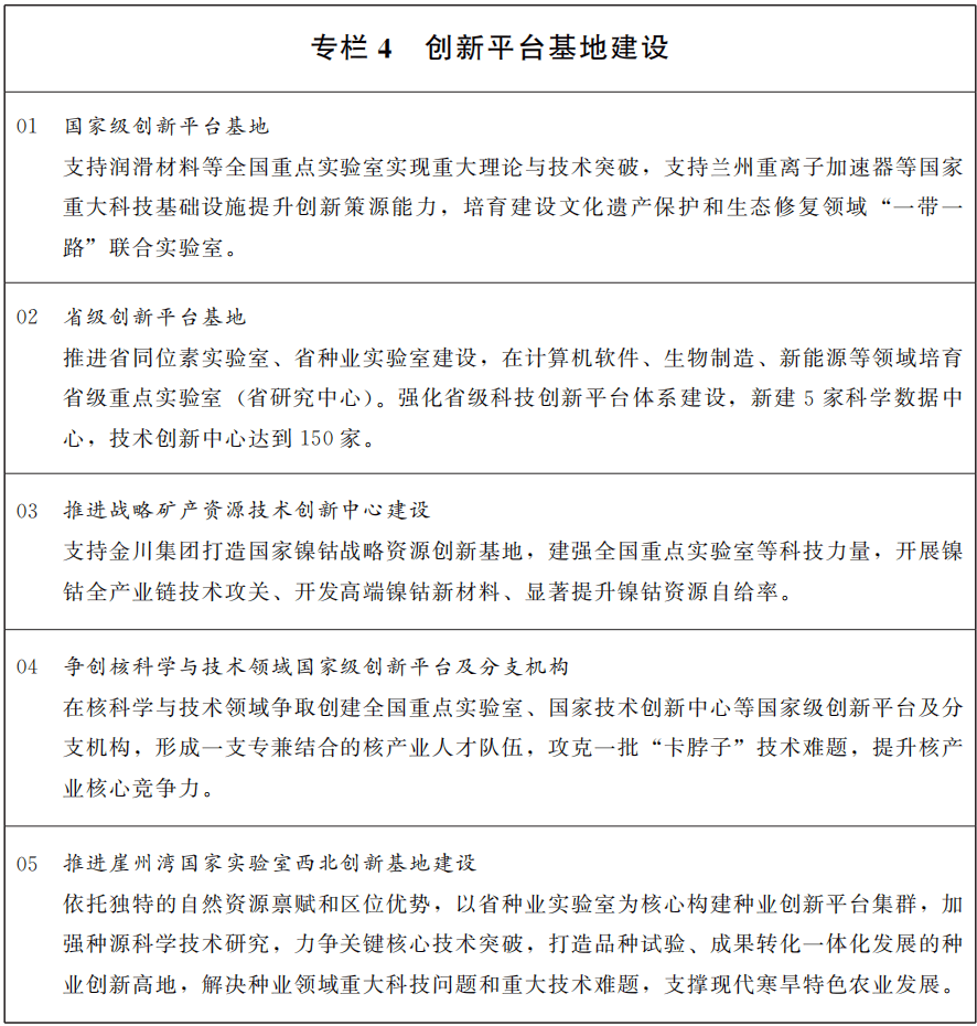 加力推进创新策源能力建设,聚力打造高能级创新平台,争取国家实验室、全国重点实验室、“一带一路”联合实验室、国家技术创新中心等国家级创新平台基地及分支机构在甘布局建设。稳步推进省重点实验室、工程研究中心、技术创新中心、临床医学研究中心、野外科学观测研究站等创新平台基地建设,建立健全省级科技创新平台分类支持、分级管理、定期评估、动态调整机制,加快重大科技基础设施体系化建设和开放共享。强化兰州白银国家自主创新示范区和兰白科技创新改革试验区的创新极核功能,促进科技成果转化应用,发挥兰白科技创新改革试验区技术创新驱动基金引导作用,推动“兰白两区”提质增效。支持兰州打造西北产业创新中心。