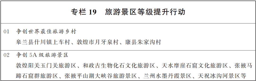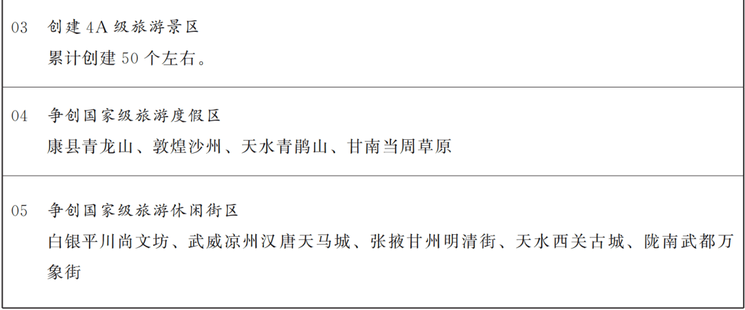坚持以文塑旅、以旅彰文,强化系统谋划和科学布局,推动文化和旅游业态融合、产品融合、市场融合,着力完善现代旅游业体系,提升旅游供给水平和服务质量,不断放大文旅产业综合效应,走出具有甘肃特色的旅游发展之路。大力发展全域旅游,构建全域文旅康养产业融合发展新格局,打造黄河文化旅游带和丝绸之路文化旅游“千里走廊”。推动文旅设施强基焕新和微改造精提升,优化旅游公共服务设施布局和功能,建设一批全国知名度高的旅游景区和度假区,打造建设若干文化特色鲜明的国家级旅游休闲城市,创新推出更多彰显甘肃文化元素的旅游业态和产品,提升“如意甘肃”旅游品牌影响力。培育“文旅+”“+文旅”新业态,发展智慧旅游、强化智慧景区建设,推动嘉峪关关城、天水麦积山、张掖七彩丹霞、永靖刘家峡等知名景区(度假区)不断丰富业态、持续优化管理,创建一批国家级、世界级文化旅游品牌。推进自驾游目的地和营地建设。打造“陇上乡遇”乡村旅游品牌。发展假日经济、避暑等旅游业态。实施红色旅游创新提升行动,传承红色基因,开发红色陇东、长征会师、载人航天等经典线路。加快推进会宁、华池、高台、迭部创建红色旅游融合发展区,提升腊子口战役遗址、两当兵变旧址等16个国家红色旅游经典景区品质,推动“红色沃土、长征丰碑、浴血河西”三大红色文化旅游区建设。构建全方位、立体化宣传营销体系,提升入境游便利化国际化水平。实施文旅产业经营主体引育专项计划,加快引育文旅运营、在线旅游服务、文创产品开发、演艺经纪、酒店管理等企业,加快培育壮大文旅经营主体,增强文旅产业发展支撑力。