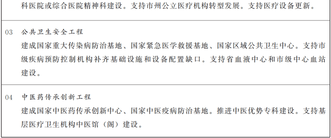 加大中医药发展支持力度,加快建设国家中医药综合改革试验区、中医药产业发展综合试验区。发挥中医药治未病、重大疾病治疗、传染病防治和卫生应急等重要作用,加强优质高效中医药服务体系建设。提升国家中医区域医疗中心、国家中医药传承创新中心、国家中西医协同旗舰医院、国家中医疫病防治基地示范带动能力。建立中医传染病临床救治和科研体系,打造中医药疫病防治和紧急医学救援队伍。促进中西医协同和民族医药发展。实施中医药康复服务能力提升工程。支持有条件的中医医院牵头建设医疗联合体,加强基层医疗卫生机构中医馆(阁)建设。加快促进中药材种业发展,大力推进中药材规范种植,提升中药饮片和中成药质量。开展经典名方、名老中医经典验方等研发创新,推动“甘肃方剂”向中药新药转化。强化中医药特色人才培养,推动中医药健康养生文化创造性转化、创新性发展。支持中医药产学研用开放发展,提升中医药国际影响力。办好中国(甘肃)中医药产业博览会。