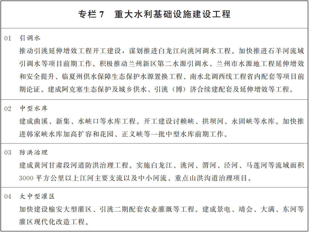 坚持节水优先和大中小微水利设施协调配套,围绕“四横一纵、九河连通、多源互济、统筹调配”省级水网主骨架,加快建设现代化水网体系。加力推进引洮延伸增效、石羊河流域调水等重大引调水工程,从根本上破解工程性缺水瓶颈制约。以联网补网强链为重点,加快建设一批区域性输配水通道工程,提升水资源优化配置能力。强化城市骨干水源和应急备用水源建设,推进城乡供水一体化,提升供水安全保障能力。加快推进控制性调蓄工程建设,有序实施一批中小型水库,提高水资源调蓄能力。加强灌区现代化改造和精细化管理,在水土资源条件适宜地区建设一批大中型灌区,增强供水灌溉保障能力。实施大江大河及重点支流、中小河流和重点山洪沟道防洪治理工程,开展病险水库(水闸)除险加固。加强雨水情监测预报等灾害防御能力建设。持续推进地下水保护治理行动,逐步实现采补平衡。