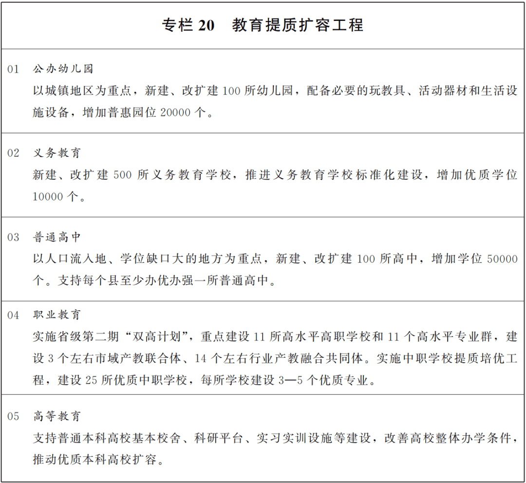 持续深化基础教育综合改革实验区建设,提高教育公共服务质量和水平,加快构建公平优质基础教育体系。科学布局义务教育学校,提高公办义务教育规模占比,扩大城镇义务教育学位供给,构建与常住人口变化趋势相适应的中小学布局动态调整、学位供给机制。推动义务教育优质均衡发展和城乡一体化,改善提升义务教育薄弱学校基本办学条件,加强义务教育学校标准化建设。实施重点地区公办幼儿园扩容工程,增加普惠性幼儿园学位数量,办好乡镇公办中心幼儿园,促进学前教育优质普惠发展。推进高中阶段学校多样化发展,优化高中阶段教育布局结构,扩大普通高中办学资源,实施“县中振兴”工程,重点改善县域普通高中基本办学条件。稳步扩大免费教育范围。引导规范民办教育发展。完善覆盖全学段的学生资助体系。鼓励建设九年一贯制学校。完善特殊教育保障机制。加强专门学校建设和专门教育工作。
