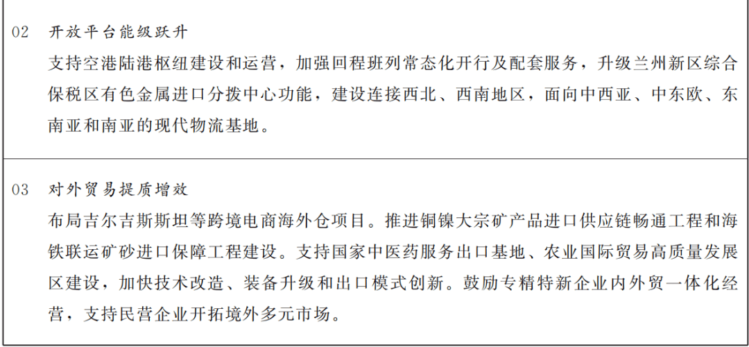 深化改革开放迈出新步伐。重点领域改革扎实有效,国企改革三年行动及深化提升行动高质量收官,完成煤电、水利、环保、国际物流等领域专业化整合,省属企业资产达到1.95万亿元、增长34.48%。民营企业活力持续增强,累计新增民营企业20.2万户,民营经济占比较2020年提高4.6个百分点。营商环境大幅改善,政务服务事项全程网办率达到98%以上,在全国率先推行投资项目信用承诺制改革,“标准地”改革实现“拿地即开工”,“甘肃信易贷·陇信通”平台服务中小微企业能力持续增强,营商环境建设实现“西部领先、全国靠前”目标。国家向西开放战略通道地位日益彰显,新开通国际货运班列线条、国际货运航线亿元,成功举办兰洽会、文博会、药博会等重大展会,甘肃对外美誉度与影响力持续扩大。“引大引强引头部”行动纵深推进,招商引资到位资金年均增长26.4%。